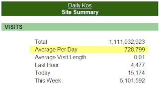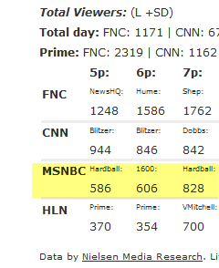 Just compare the daily visitor count at Daily Kos with the most recent Total Viewership Numbers (in thousands) for the various cable shows in Brit Hume’s time slot and in the hour before and after: