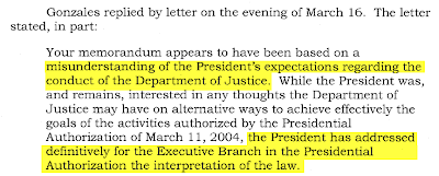 To say that “a viable legal rationale could not be found” and that there is no “legal basis to support” these Other Intelligence Activities is to say that they are criminal. And even DOJ lawyers so extreme that they were willing to approve the illegal NSA program we know about concluded this was so. Nonetheless, they went on for two years at least, and Bush ordered them to continue even after his own DOJ concluded they were criminal. Revealingly, Alberto Gonzales explicitly told top DOJ lawyers that the White House didn’t care about their views that what Bush was doing was illegal because that renowned legal scholar — George W. Bush himself — declared that they were legal: