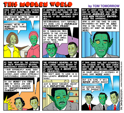 That’s why so many media figures want to Look Forward and Not Backwards — not only because they want to protect high-level political officials who committed felonies and thus preserve America’s two-tiered justice system, but more so, because they know that “looking backwards” would reveal who and what they really are. People who engage in heinous acts always want everyone to look forward and not backwards, for reasons that are as obvious as they are ignoble. Tom Tomorrow captured this mentality perfectly in a cartoon this week (click to enlarge):