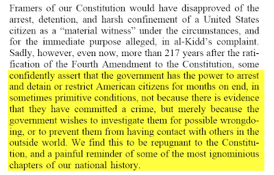 I really urge everyone to read the section of the court’s decision which sets forth in a concise, clear and non-legalistic manner the facts of what was done to al-Kidd by the DOJ: it’s just 3 pages long, beginning on page 12271 (“Facts and Procedural Background”) through 12274 (the three pages after that, also highly recommended, detail Ashcroft’s culpability in creating this nefarious, illegal detention scheme). Please just go read this 3-page section laying out the facts of what was done to al-Kidd’s life and what preventive detention powers allow the Government to do. Anyone who supports Obama’s call for a preventive detention scheme is, by definition, supporting things like this (though, if anything, what happened to al-Kidd — as horrible as it is — is short and innocuous compared to what a “prolonged detention” scheme would permit: years of indefinite, charge-free imprisonment).
