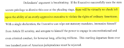 For that reason, as they pointedly noted the last time the Obama DOJ sought to compel dismissal based on this claim: ”defendants’ motion is even more frightening than the conduct alleged in the Amended Complaint.” Think about that argument: the Obama DOJ’s secrecy and immunity theories are even more threatening than the illegal domestic spying programs they seek to protect. Why? As the plaintiffs explains (click image to enlarge)
