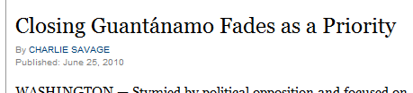 Savage writes that it is “unlikely that President Obama will fulfill his promise to close it before his term ends in 2013”; quotes Sen. Carl Levin as saying that “the odds are that it will still be open” by the next presidential inauguration; and describes how Sen. Lindsey Graham — who is actually trying to close the camp — is deeply frustrated with the White House’s refusal to spend time or energy to do so, quoting him as saying that the effort is “on life support and it’s unlikely to close any time soon.” So that appears to be a consensus: Guantanamo — the closing of which was one of Obama’s central campaign promises — will still be open as of 2013, by which point many of the detainees will have been imprisoned for more than a decade without charges of any kind and without any real prospect for either due process or release, at least four of those years under a President who was elected on a commitment to close that camp and restore the rule of law.