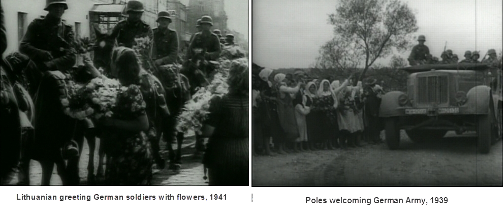 To underscore the point, consider these photographs of ethnic Germans in Lithuania handing flowers to invading German soldiers, and citizens of Ukraine and Poland doing the same, all from the BBC documentary, Nazis: A Warning from History (click on photogaphs to enlarge):