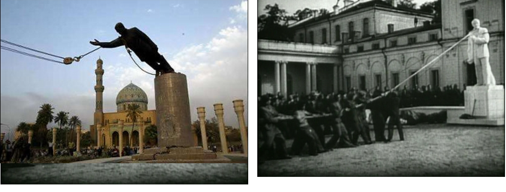 As Schwarz wrote: “I don’t know who took this footage, but I would bet a lot of money it was the Nazis themselves, and that they rushed it back to the home front to demonstrate the extraordinary morality of their cause.” And just to bolster the point a bit more, compare the propagandistic photograph on the right (below) used by Germans in 1941 to show that Lithuanians welcomed their invasion (depicting citizens pulling down a statue of an oppressive Communist ruler, likely Lenin), to the virtually identical, iconic photograph on the left of the staged scene of Iraqis “celebrating” the American invasion by pulling down a statue of Saddam: