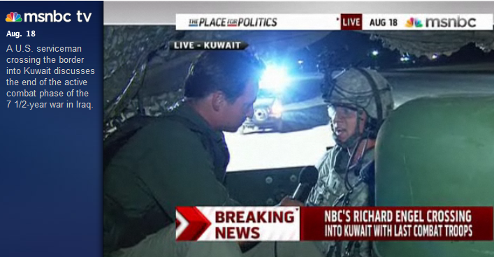 By offering it exclusively to both NBC and MSNBC, the Pentagon ensured that this narrative would be given the Seriousness imprimatur from NBC, and would produce base-pleasing, Obama-favorable praise from MSNBC personalities. Having Engel embedded in a Stryker vehicles as it “rolled out” of Iraq, and Maddow stationed in the Green Zone, added to the historic tone of the evening. As The New York Times‘ Brian Stelter reported: ”David Verdi, an NBC News vice president, added, ‘The military had said, ‘You are the ones who are going to broadcast it first’.” About that, Mediaite‘s Steve Kraukauer wrote: ”That’s a stunning admission, and shows a degree of coziness between both sides here.” With this cooperative venture, the White House got exactly the coverage it wanted: the repeatedly hyped claim that under Barack Obama, “American combat forces are leaving Iraq,” as Olbermann intoned at the start.