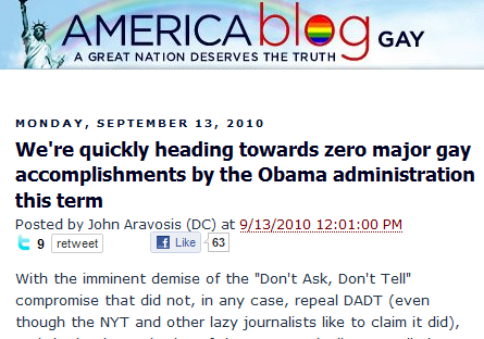 UPDATE: Here’s the headline of a post by John Aravosis today, reviewing the Democrats’ records on gay issues over the last two years: