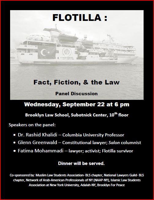 UPDATE III: I had been promoting the Wednesday flotilla event at Brooklyn Law School because I was told by event organizers that it was open to the public. I was just sternly informed by the Dean of Brooklyn Law School, however, that the event is not, in fact, open to the public, but to the law school community only. My apologies to anyone who planned to attend.