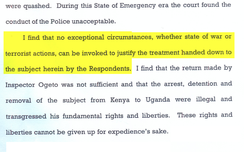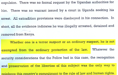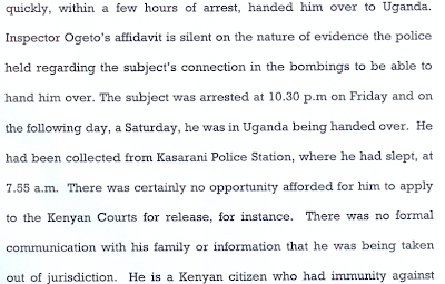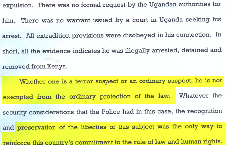 As Majanja noted in his email to me, Kenya faces a massive threat from terrorism. Radicals bombed the U.S. embassy in Nairobi in 1998 and attacked an Israeli-owned tourist resort and Israeli airliner in Mombasa in 2002, and that country has repeatedly been under Terrorist threats for the last decade. Nonetheless, consider this court decision that was just issued in Nairobi on Thursday. A Kenyan Muslim, Mohamed Sulemein, was detained in August — without any charges or due process — by Kenyan anti-terrorism agents (the ATPU), accused of having participated in the horrific June World Cup bombings in Kampala, Uganda, which killed 74 innocent people. He had his passport seized and was told he would be sent to Uganda without any opportunity to contest the accusations against him. His wife filed a habeas corpus petition in a Kenyan court, demanding that “he be treated in accordance with the laws and Constitution of Kenya,” which, among other things, guarantees the right to be charged with a crime within 24 hours of arrest and not to be shipped outside the country without a hearing.