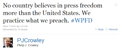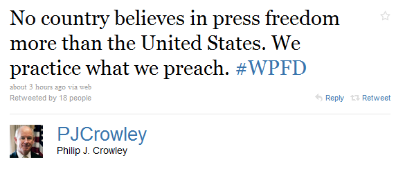 That “WPFD” after his message refers to “World Press Freedom Day,” which the U.S. is hosting in 2011 and whose theme could not possibly be any more contrary to the U.S.’s behavior these past two weeks. The only possible competitor for the Unintentional Self-Satire of the Month Award is the fact that Joe Lieberman is a member of the “Global Internet Freedom Caucus” and even sponsored a bill to support “Internet censorship victims” in Iran — the very same Joe Lieberman who thuggishy threatened companies this week not to associate themselves with WikiLeaks in light of the documents they published on the Internet.