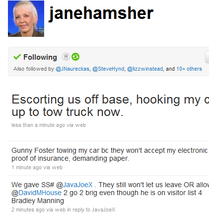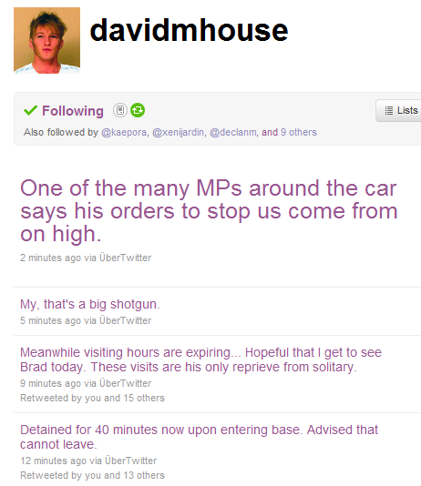 UPDATE: As they have done several times before, Jane Hamsher today drove David House to visit Bradley Manning at the Quantico brig — this time, as they announced ahead of time, House intended to deliver to brig officials a petition relating to Manning’s detention conditions which has been signed by 42,000 people (only House is on the approved visitors list, so Hamsher typically drops him off, waits at a base McDonald’s nearby [as she’s been instructed to do], and then picks House up once his visit is done). Today, they went to the brig and House attempted to enter, the same way as always, but, as of 1:45 2:15 pm EST, both of them have been detained for 45 minutes 1 hour and 20 minutes, and told that they are not permitted to leave or else they will be arrested. They have now been told — without explanation — that they are not permitted to enter, and Hamsher’s car is being towed off the brig’s property and impounded. Here is House’s live Twitter feed sent during this episode (start at the bottom and read up):