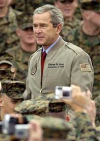 As the Dixie Chicks found out, anyone who didn’t agree could expect to be met with a furious reaction from conservatives who enforced the new patriotism with near religious fervor. And their love of country was not confined to the military. When president George W. Bush donned a Navy flight suit and landed on an aircraft carrier in a fighter jet to (prematurely) declare victory in Iraq, the right wing went into a major collective swoon. You could even buy a bronze bust of George W. Bush wearing the jumpsuit that was advertised with this stirring sales pitch: