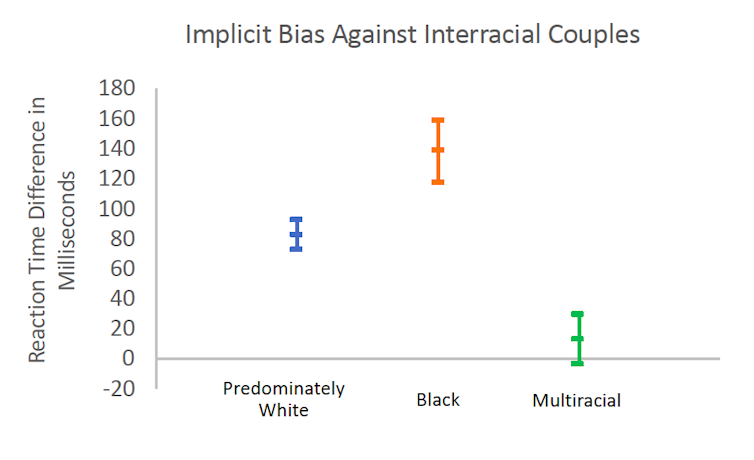 We assessed implicit biases using something called the implicit association test, which requires participants to quickly categorize same-race and interracial couples with positive words, like “happiness” and “love,” and negative words, like “pain” and “war.” If it takes participants longer to categorize interracial couples with positive words, it’s evidence that they likely possess implicit biases against interracial couples.