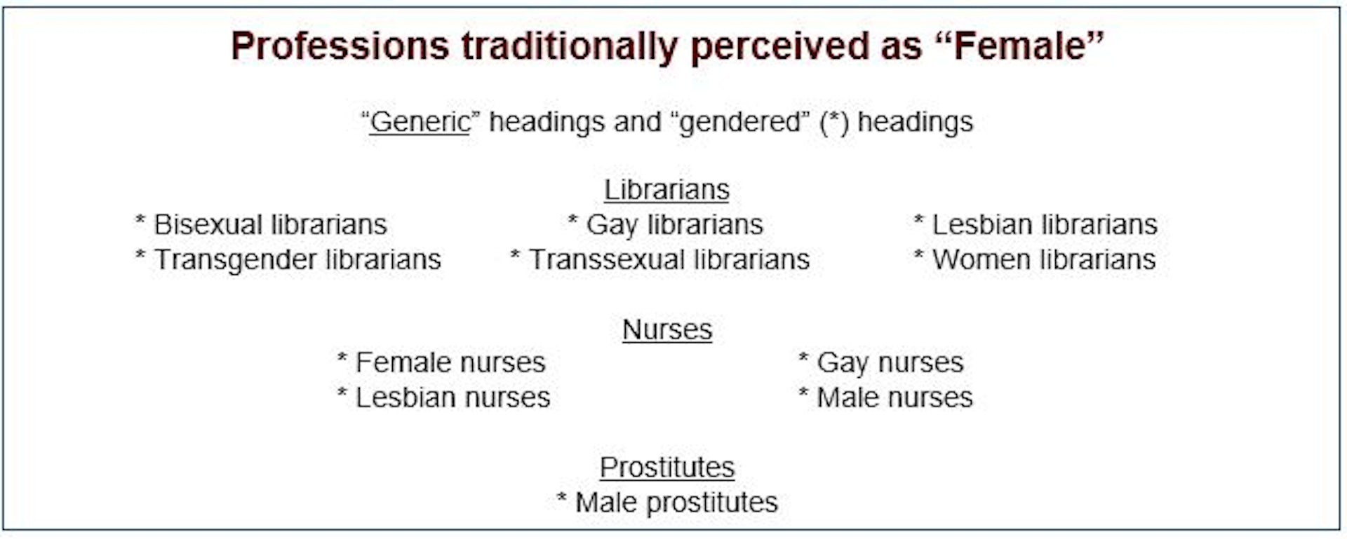 Another exercise I did was to search for professions that are traditionally perceived as female. Nurses, for example, were divided equitably, with subjects for both “Male nurses” and “Female nurses.” However, under “Prostitutes,” there was only a “Male prostitute” subject heading, revealing the generic assumption that most prostitutes are female.