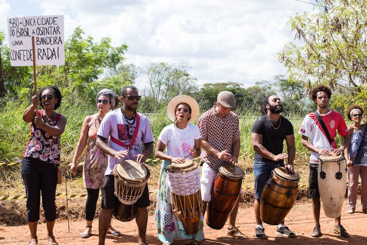 This year, black activists outside the cemetery in Santa Bárbara d’Oeste carried the same message, saying “a lot of blood” was shed under the auspices of the Confederate flag. They also played drums and practiced capoeira, an Afro-Brazilian dance and martial art form, in a display of Brazil’s deep African roots.