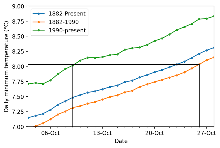 Hobart’s daily minimum temperature in October for three time periods: 1882-present, 1882-1990, and 1990-present. The last 30 years have been much warmer on average than the years before.
