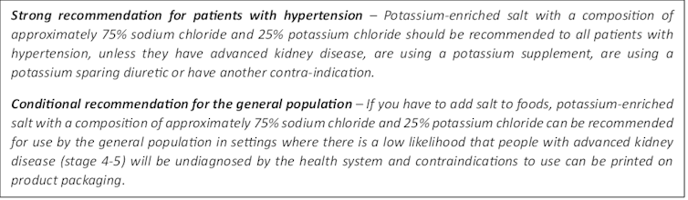 While many guidelines recommend increasing dietary potassium intake, and all refer to reducing sodium intake, only two guidelines – the Chinese and European – recommend using potassium-enriched salt.