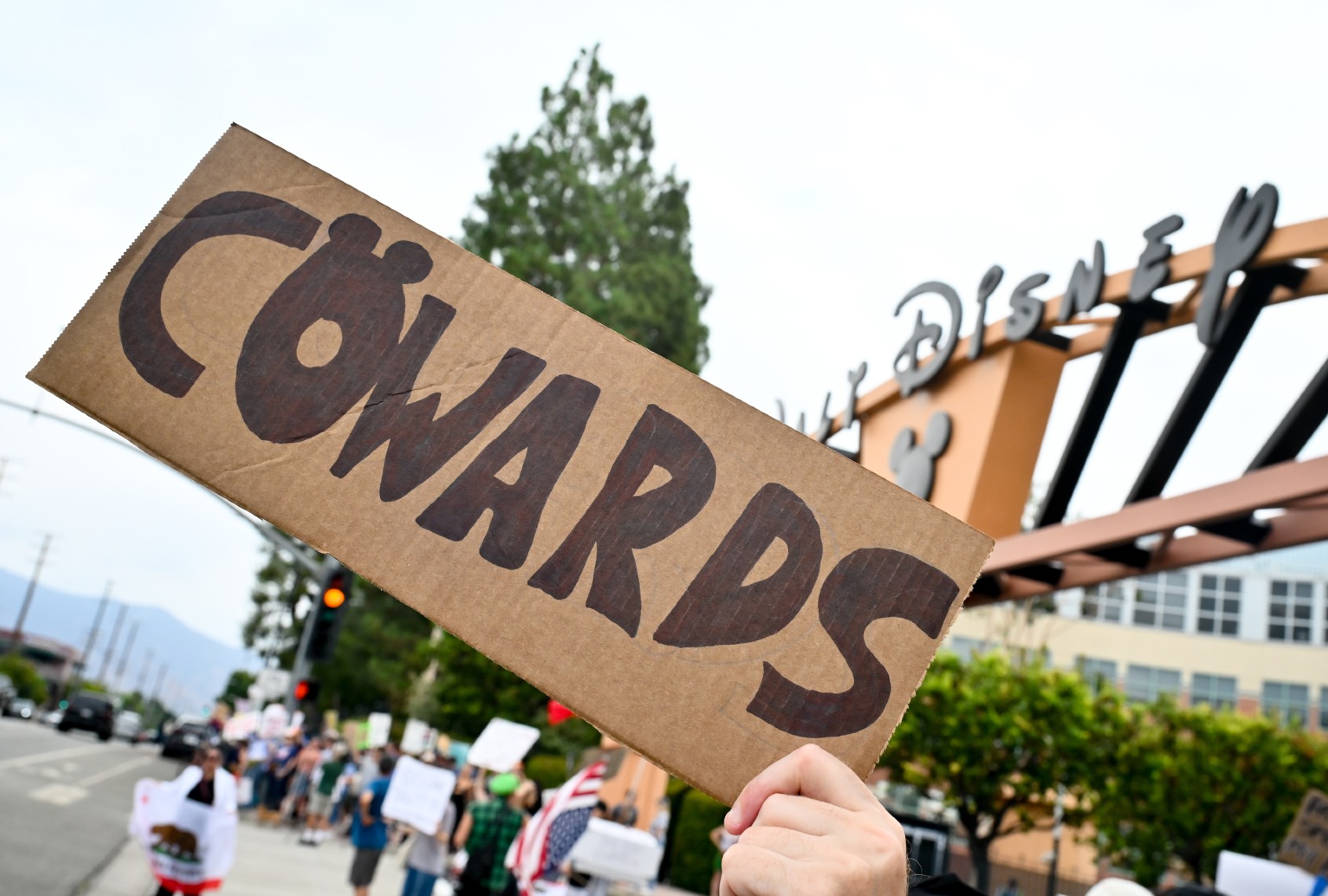 (DAVID PASHAEE/Middle East Images/AFP via Getty Images) Protesters display signs reading “This Sucks” and “Boycott Disney” outside the Walt Disney Studios in Burbank, Calif., on Sept. 19, 2025, during a demonstration against ABC’s suspension of Jimmy Kimmel Live!