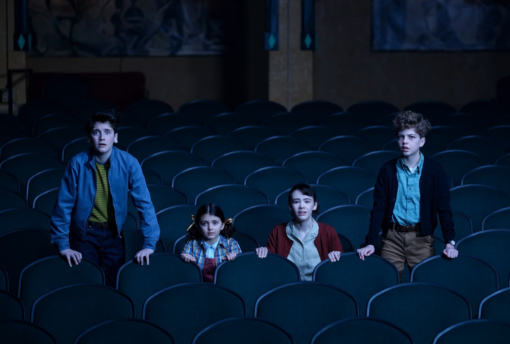(Brooke Palmer/HBO) L to R: Jack Molloy Legault, Matilda Legault, Clara Stack and Mikkal Karim-Fidler in “It: Welcome to Derry”