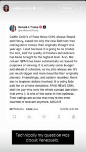 Collins’ response came in an Instagram Story, where she shared a screenshot of Trump’s message with a short caption: “Technically, my question was about Venezuela.” The remark referenced her questioning at a public event last week, where she had pressed Trump on foreign policy. Coverage of the ballroom’s cost increase had appeared in multiple outlets, including CNN, PEOPLE and Entertainment Weekly.