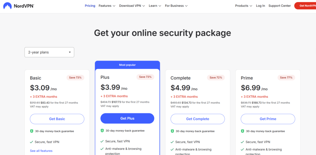 NordVPN offers several plans to suit different needs and budgets, all backed by a 30-day money-back guarantee.