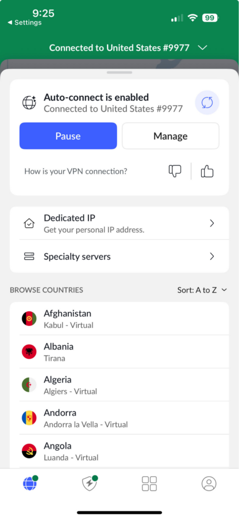The app is easy to use, with a one-click connect button that provides instant protection. Its design is clean and intuitive, even for first-time users. NordVPN maintains a consistent look across platforms, so whether you’re on your phone, laptop or TV, the experience feels familiar.