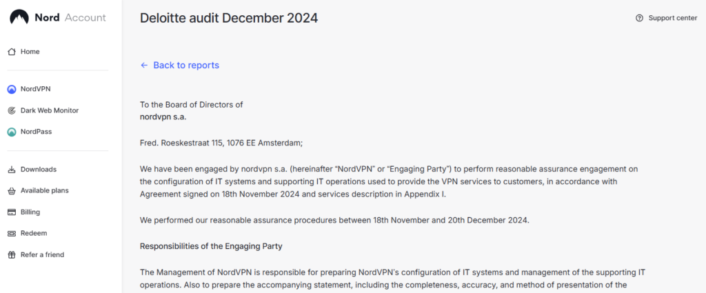 NordVPN doesn’t track what you do online—a claim confirmed by five independent audits, most recently by Deloitte in 2024. The company also publishes detailed transparency reports on a regular basis, explaining how it handles government and law enforcement requests for user data. Among its competitors, NordVPN’s privacy audits stand out for their thoroughness and frequency.