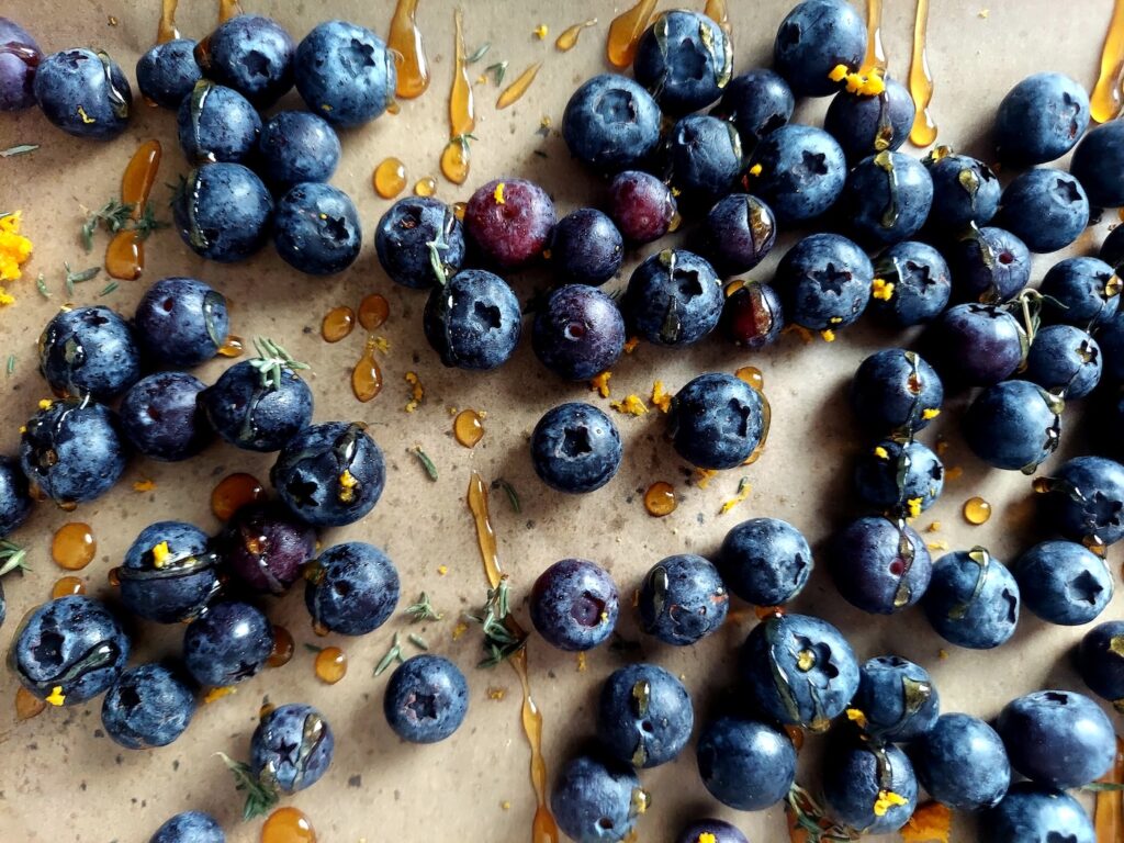 (Ashlie Stevens ) Blueberries covered in honey, orange zest and thyme, before being roasted