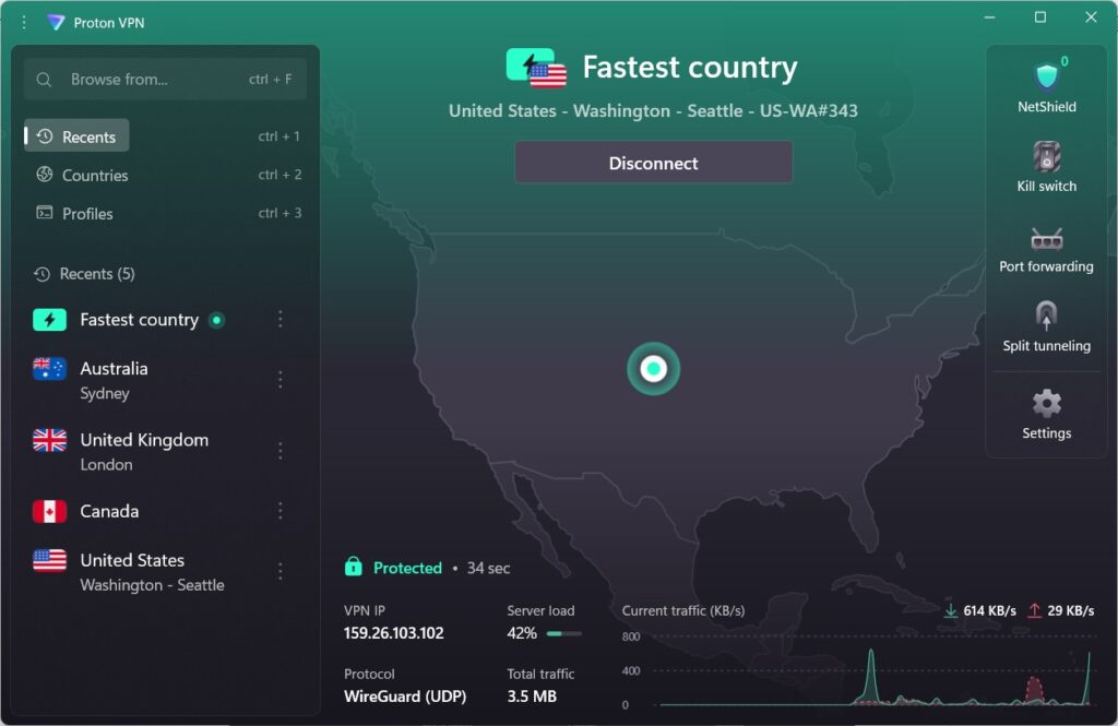 Proton VPN uses the WireGuard protocol, which is designed for fast, efficient connections. It also offers Secure Core routing for added privacy, though this can reduce speed depending on the server path. While Proton VPN connects quickly and maintains solid uptime, it didn’t outperform competitors in terms of raw speed or latency.