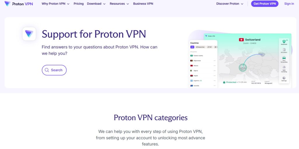 Proton VPN has an extensive and well-organized knowledge base that allows users to search for answers to their issues independently. This includes detailed setup guides, platform-specific instructions and solutions to common problems.