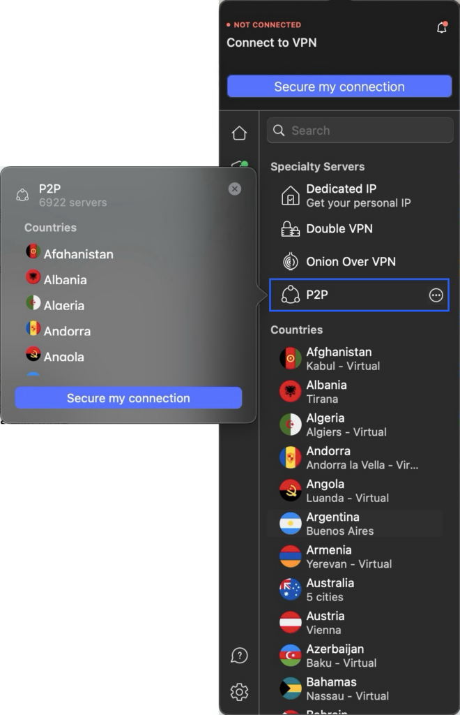 NordVPN, while still providing excellent torrenting support, takes a different approach. NordVPN offers dedicated P2P-optimized servers. So, to torrent over NordVPN, you should pick one of those. They’re accessible from the main app menu. Clicking the … next to P2P opens the server list.