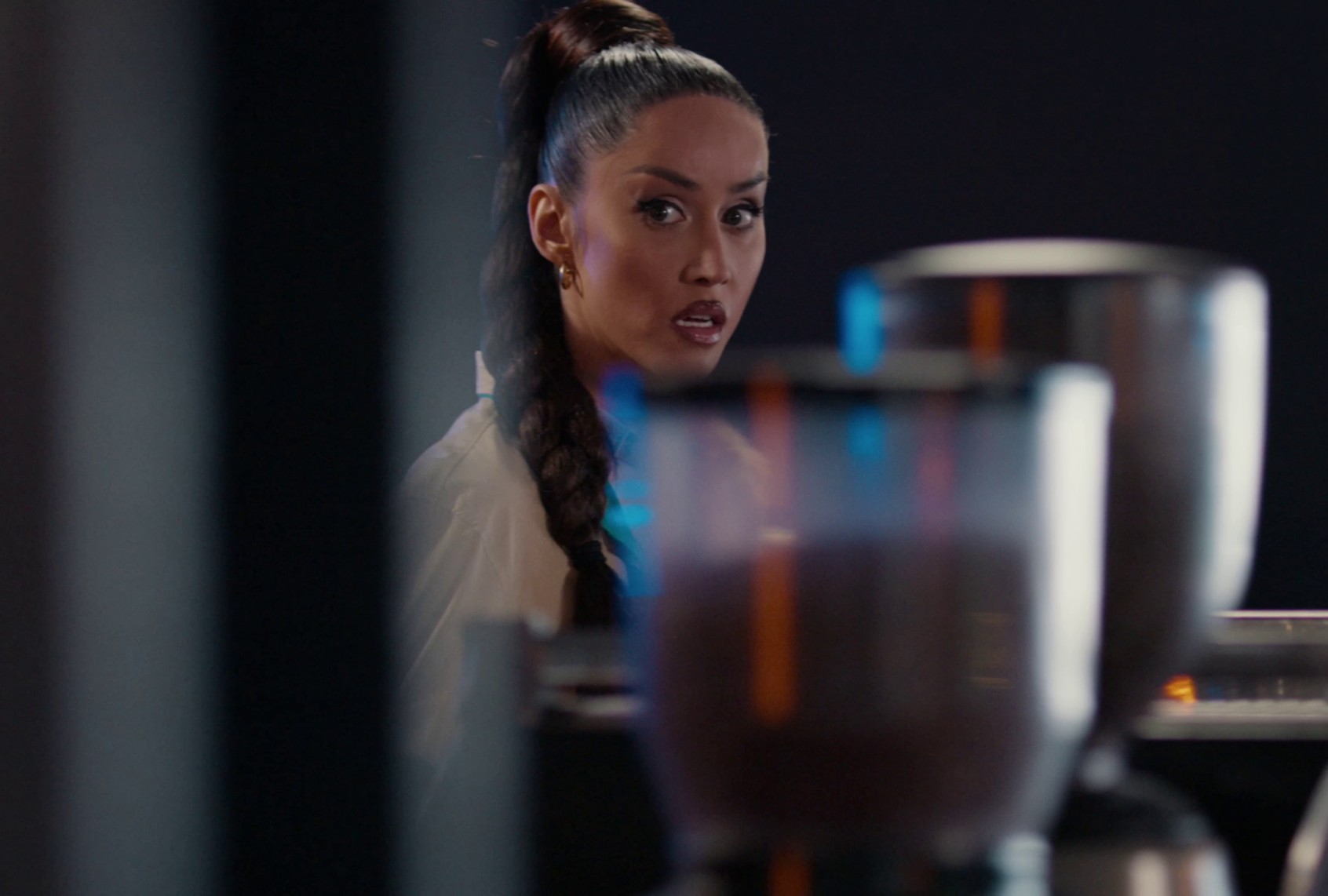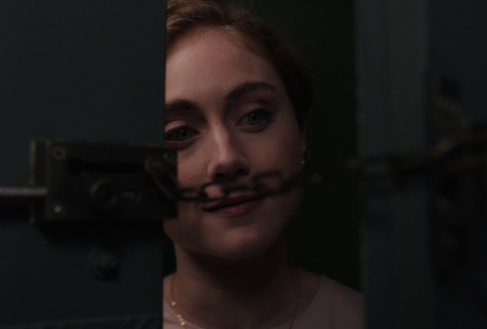 In one montage, Delano sings an original song for a predatory label executive while Wineman intercuts with glimpses of Mag, alone in a dark room and lit only by the light creeping in under the door, painting the skin under her fingernails after tearing each one off in a rage. It’s positively demented, but it’s not insanity for insanity’s sake. The light on Mag is framed like a melodramatic diva’s spotlight, and the close-ups of Delano’s electric purple lip gloss and severe makeup heighten the sequence’s sense of surrealism. That the song itself is not very good at all lends to this eeriness, too. Wineman isn’t aiming for realism. Rather, he’s using a shoestring budget to concoct left-of-center sights that feel like a peek into a specific Los Angeles netherworld. I see flashes of modern neo-noirs like Paul Schrader’s “The Canyons,” and the cold but still realistic otherworldliness in David Cronenberg’s “Dead Ringers” and “The Shrouds,” filtered through a silly, gay “Single White Female’ lens.